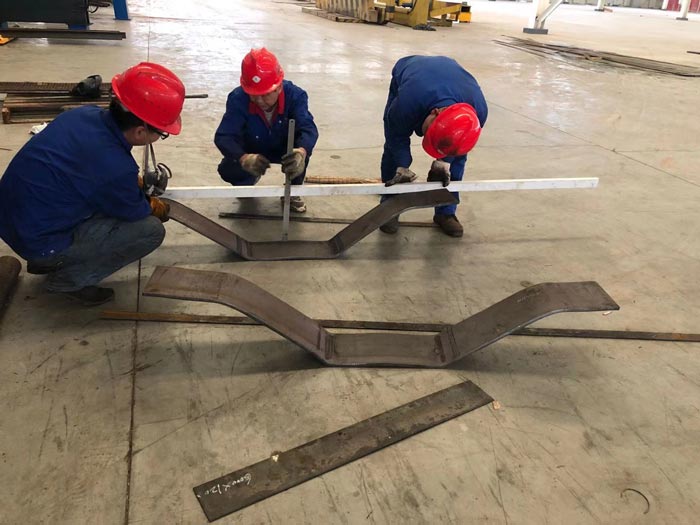 壓制這種鋼板需要使用較大噸位的液壓機。可以根據(jù)具體需求定制生產(chǎn)1500噸、2000噸、2500噸、2800噸、3000噸、3600噸、4000噸、4500噸等各種不同噸位的波紋鋼腹板成型液壓機,通過聯(lián)動墊板將活動橫梁剛性連接在一起,配合各自的供油閥或泵的控制,來保證滑塊的同步運行,從而壓制出相應的產(chǎn)品。